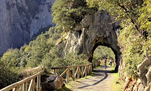 Discurre por antiguos trazados ferroviarios rodeados de bosques, túneles, ríos y puentes.